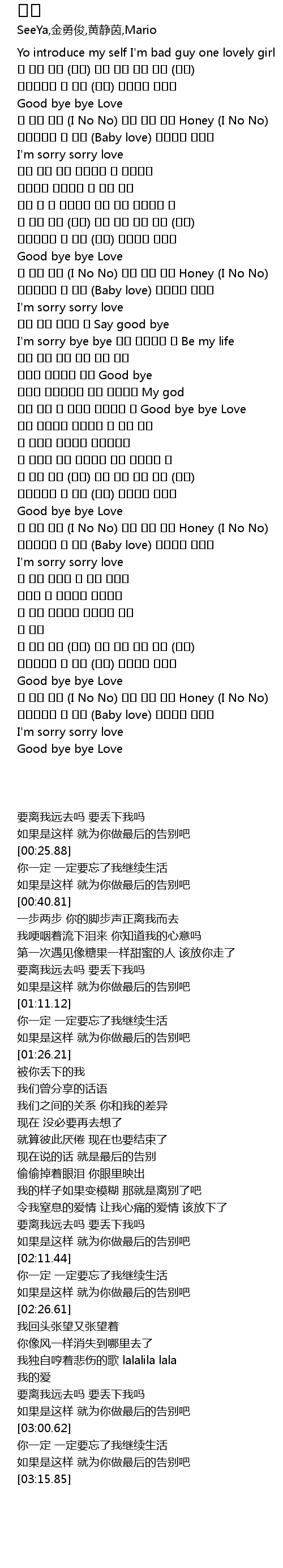 | [01:39.29] | 지금 했는 말 마지막 인사라는 걸 Good bye bye Love |