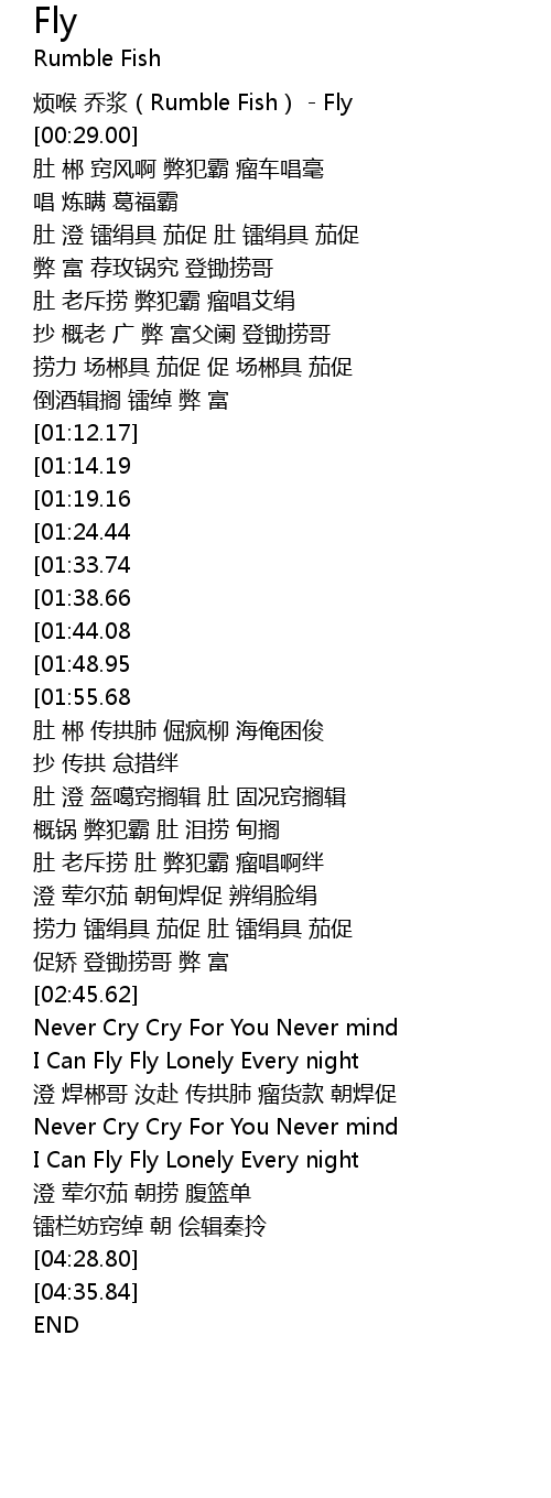 | [00:00.00] | 烦喉 乔浆(Rumble Fish) - Fly |