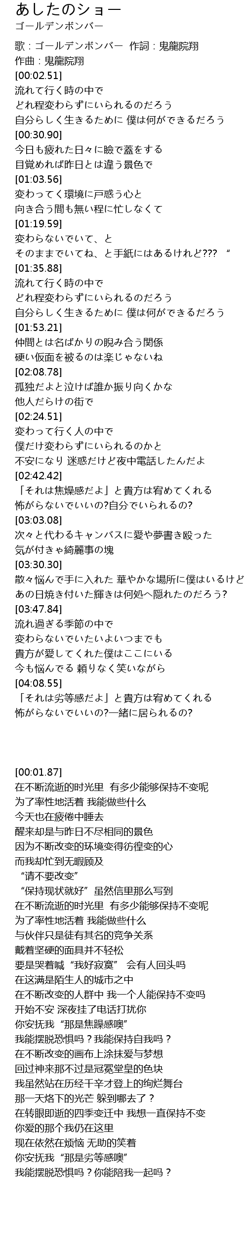 | [00:01.87] | 歌:ゴールデンボンバー 作詞:鬼龍院翔 作曲:鬼龍院翔 |