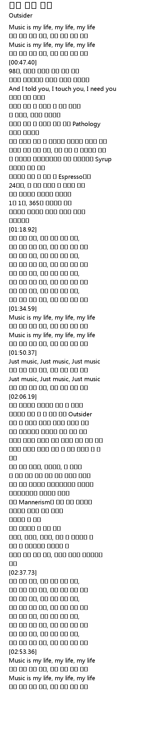 | [02:08.28] | 살아가게 해준 건 또 다른 이름 Outsider |