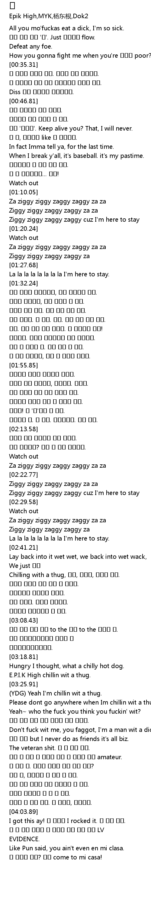 | [02:51.40] | Chilling with a thug, 개떡, 시루떡, 궁합이 찰떡. |
