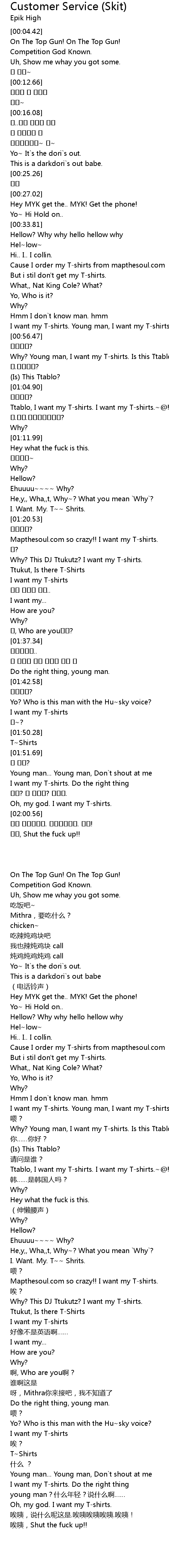 | [01:06.39] | Ttablo, I want my T-shirts. I want my T-shirts.~@!#@$! |