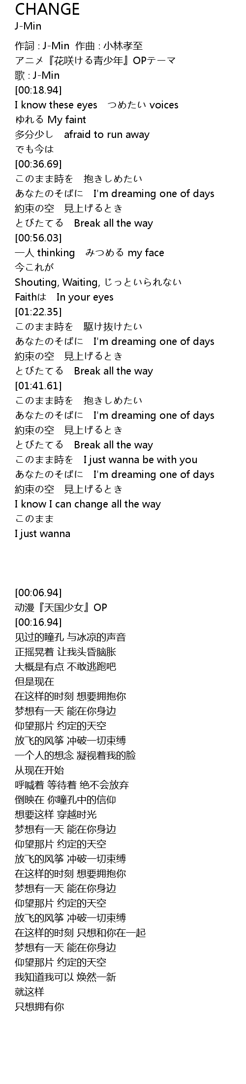 | [00:06.94] | 作詞∶J-Min 作曲∶小林孝至 |