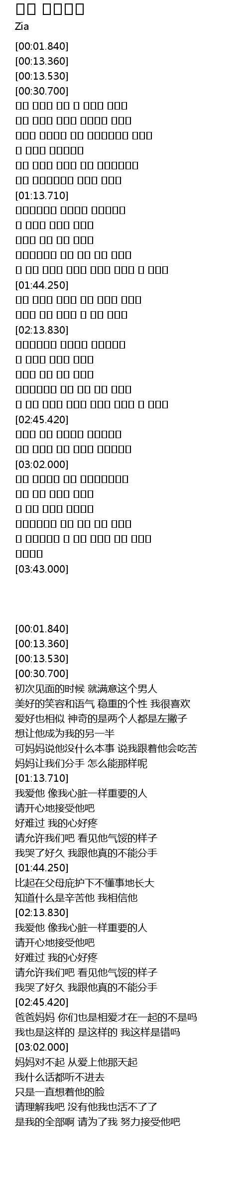 | [01:34.300] | 참 많이 울어요 우리는 절대로 헤어질 수 없어요 |