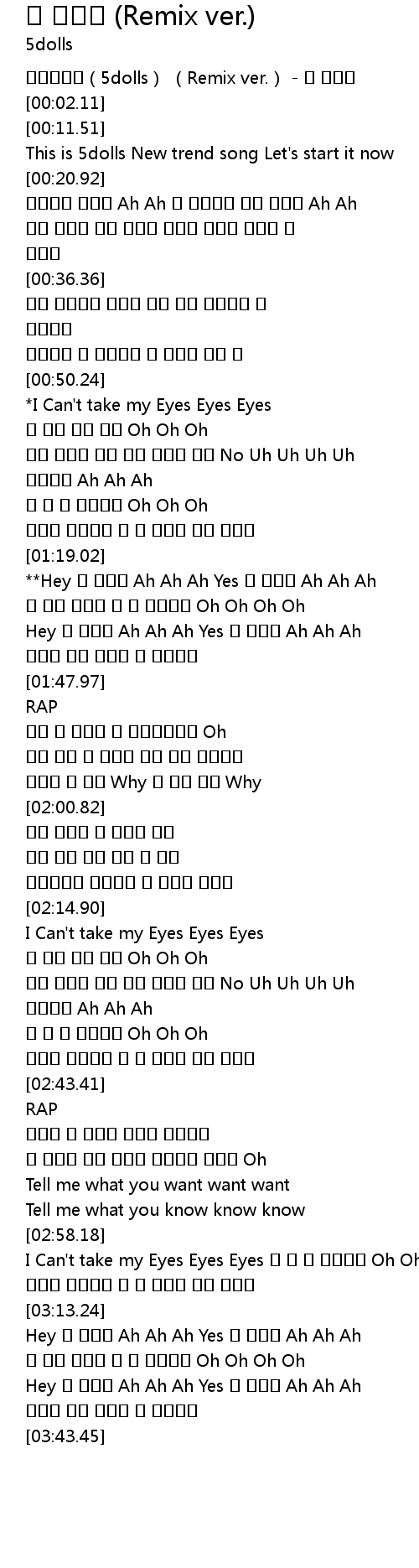 | [02:59.02] | I Can't take my Eyes Eyes Eyes 내 맘 다 들키라고 Oh Oh Oh |