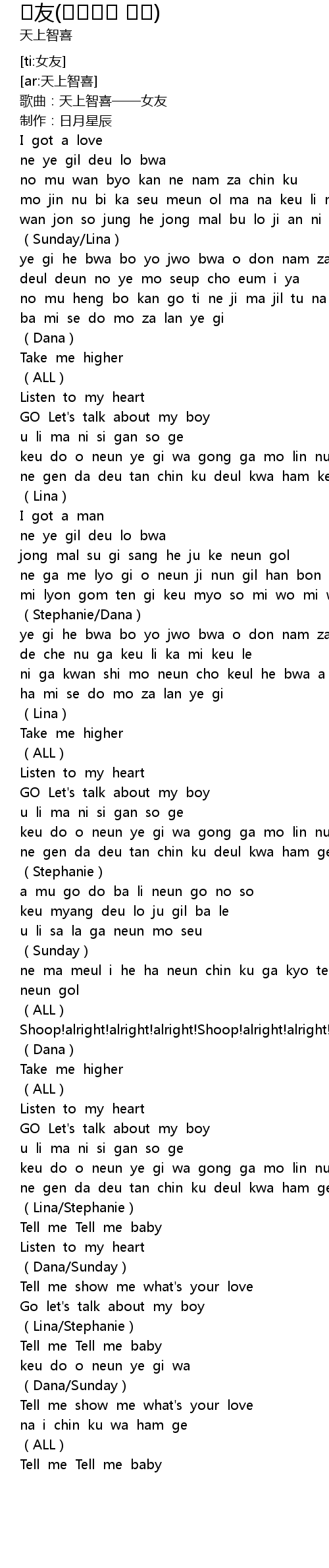 | [00:09.24] | 歌曲:天上智喜——女友 |