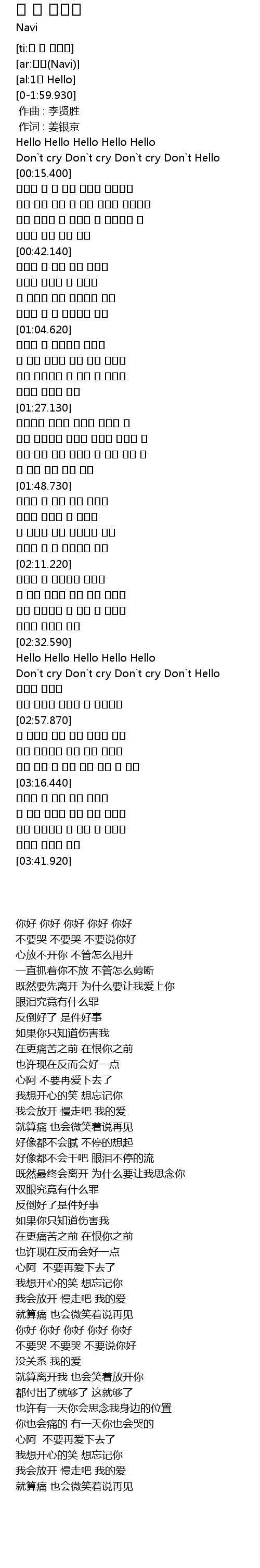 | [02:33.220] | 你好 你好 你好 你好 你好 |