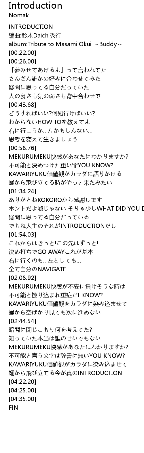 | [00:18.00] | album:Tribute to Masami Okui ~Buddy~ |
