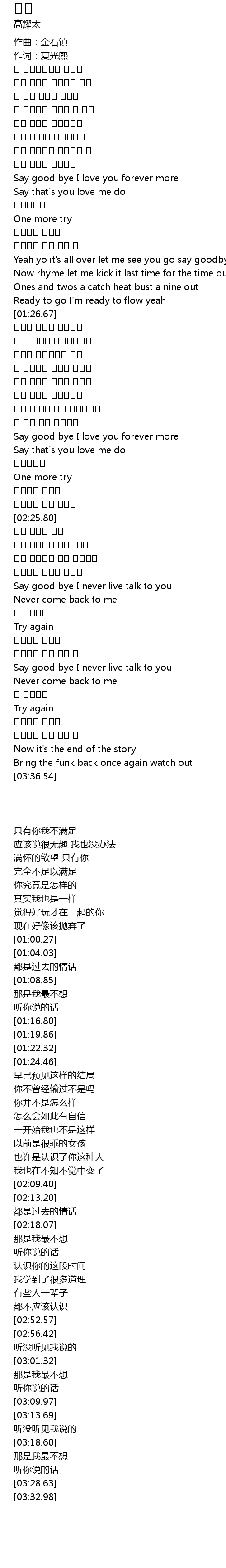 | [01:16.80] | Yeah yo it's all over let me see you go say goodbye |