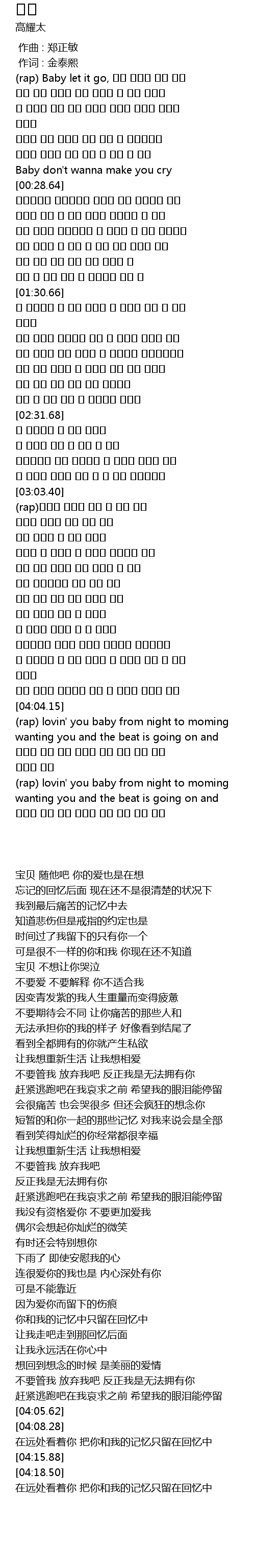 | [00:05.66] | (rap) Baby let it go, 너의 사랑도 잊고 싶은 |