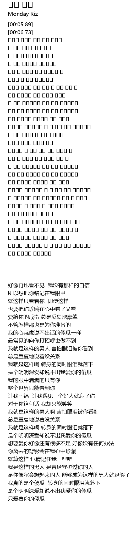 | [01:35.65] | 사랑해도 사랑한다는 그 말 하나 못한 바보이니까 |