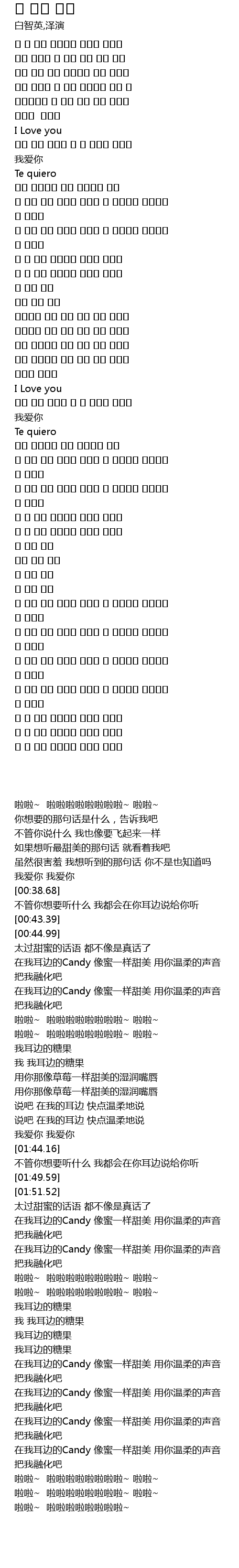 | [00:51.18] | 在我耳边的Candy 像蜜一样甜美 用你温柔的声音 把我融化吧 |