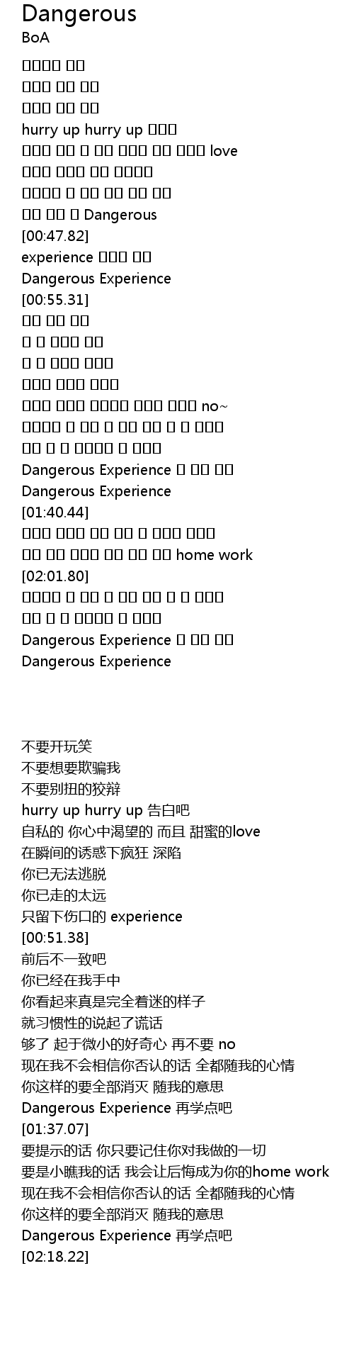 | [01:32.60] | Dangerous Experience 또 하날 배워 |