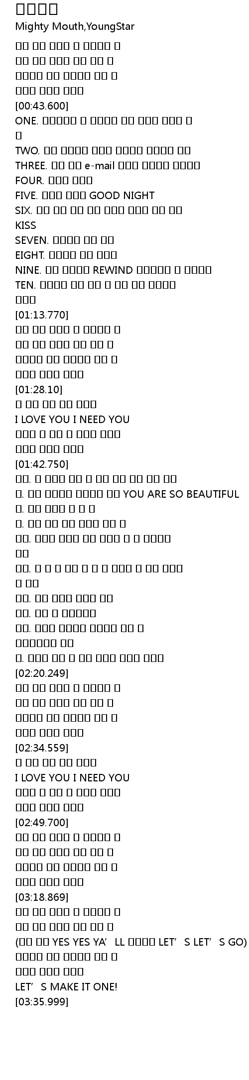 | [00:44.70] | ONE. 사랑한다는 말 아껴두지 말고 적어도 하루에 두 번 |