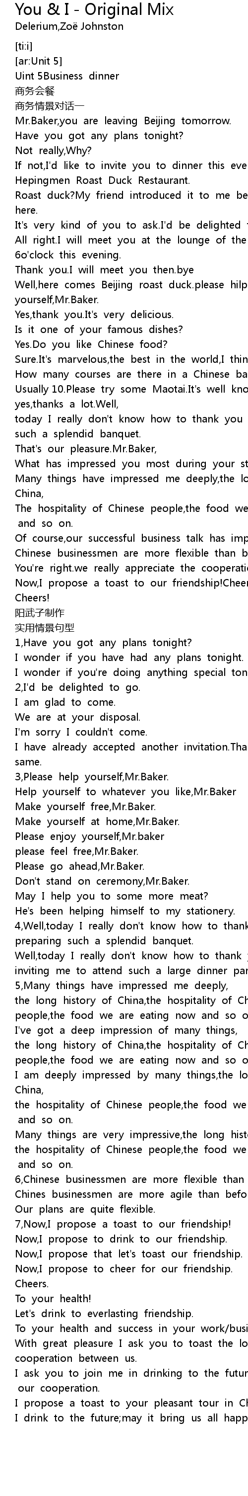 | [00:19.112] | If not,I'd like to invite you to dinner this evening at Hepingmen Roast Duck Restaurant. |