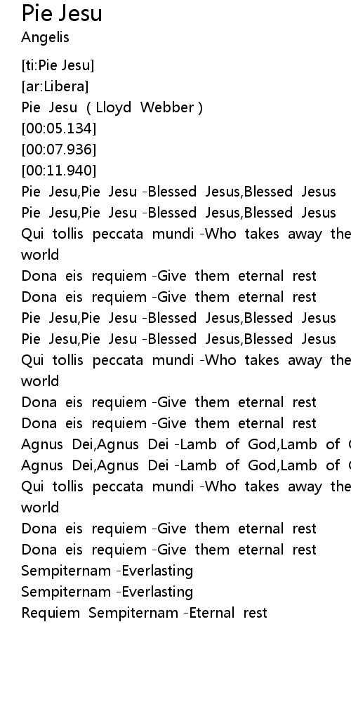 | [01:07.477] | Pie Jesu, Pie Jesu Blessed Jesus, Blessed Jesus |