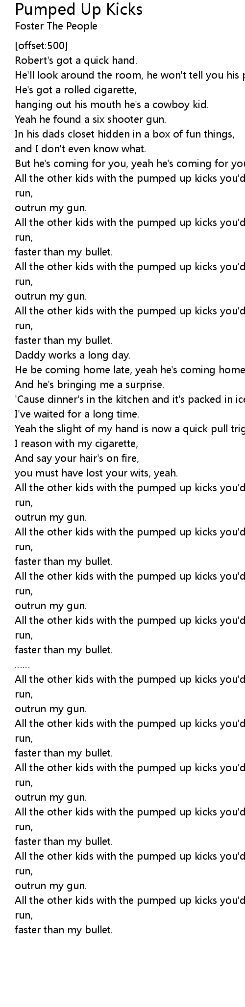 | [02:04.18] | All the other kids with the pumped up kicks you' d better run, better run, |