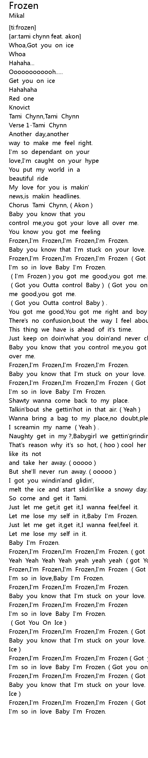 | [02:44.492] | Frozen,I'm Frozen,I'm Frozen,I'm Frozen (Got you on Ice) |