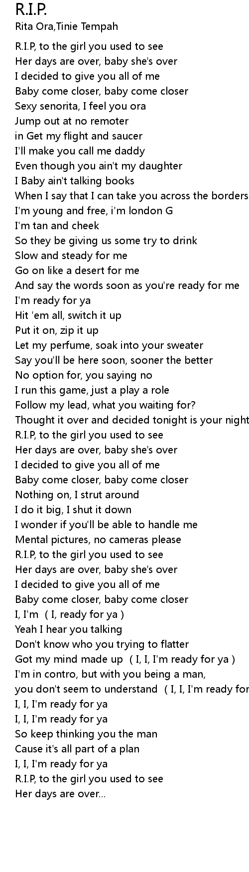 | [01:35.420] | R.I.P, to the girl you used to see |