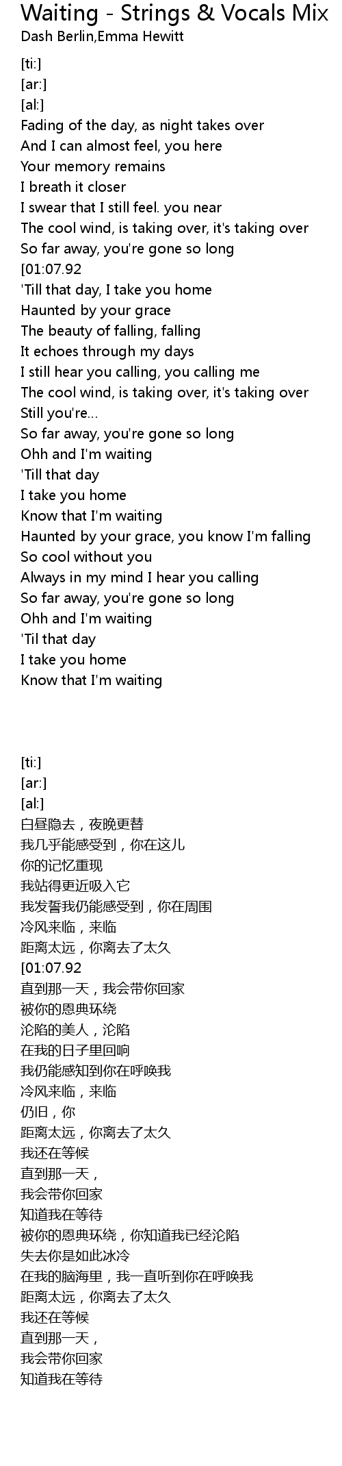 | [01:22.53][01:07.92] | Ohh and I'm waiting |