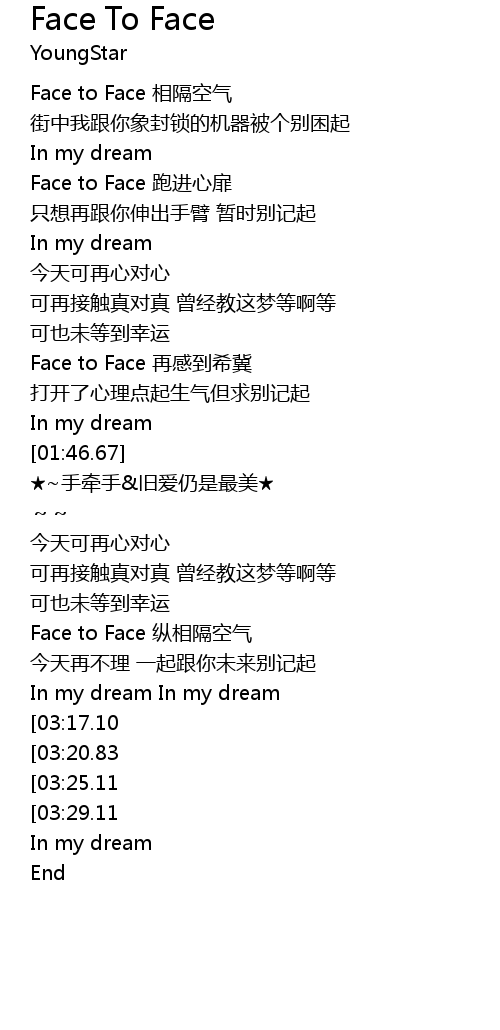 | [03:33.75][03:17.10][02:59.69] | Face to Face 再跑进心扉 |