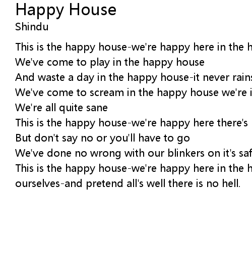 This is the happy house-we're happy here in the happy house. to forget ourselves-and pretend all's well there is no hell. |
