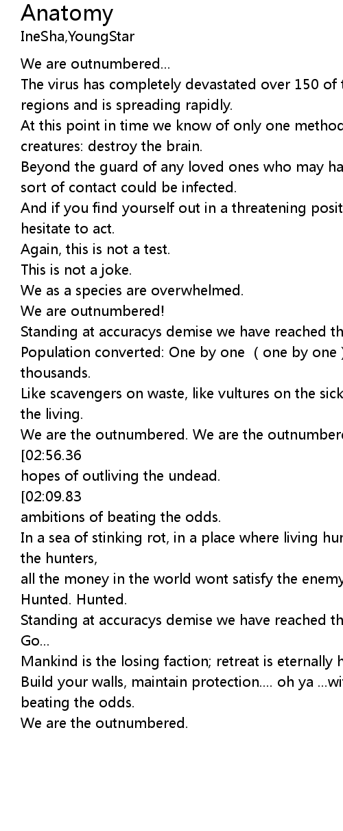 [03:06.76][02:56.36][01:59.66][01:44.13] Find your post, find your shelter in hopes of outliving the undead.