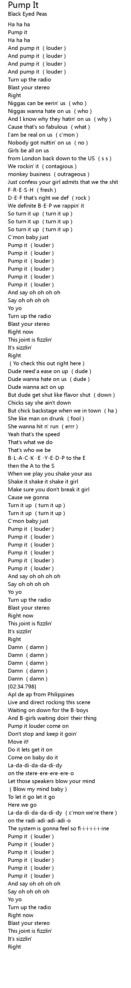 | [02:03.888] | Pump it (louder) |