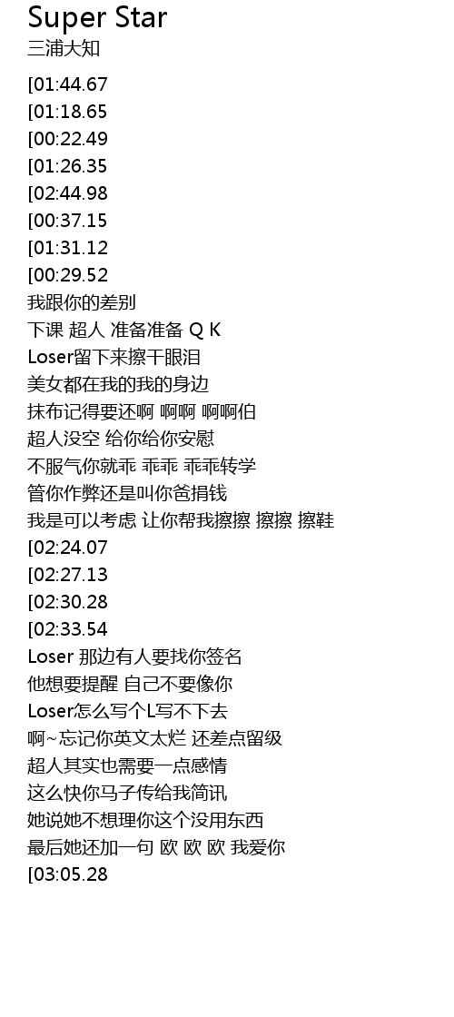 | [02:43.24][02:44.98][02:46.60][02:56.66][02:58.16][02:59.60] | year wo shi superman |