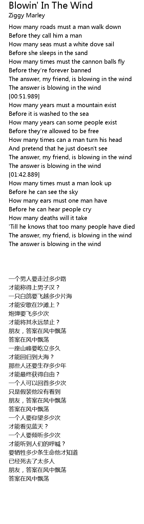 | [01:30.999] | The answer, my friend, is blowing in the wind |