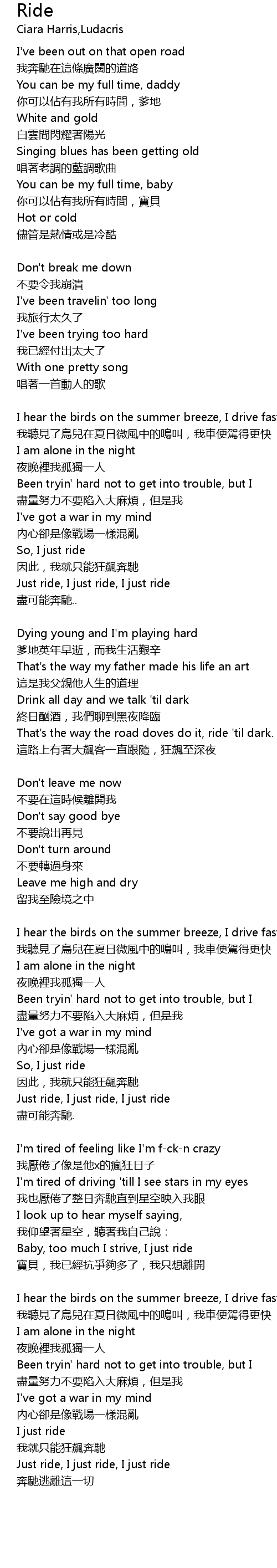 | Baby, too much I strive, I just ride | |