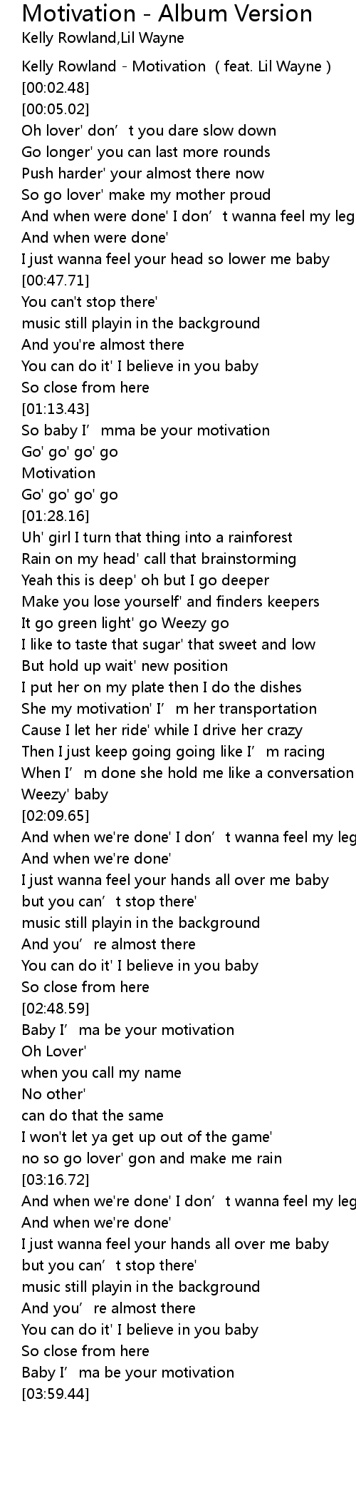 | [00:01.83] | Kelly Rowland - Motivation (feat. Lil Wayne) |