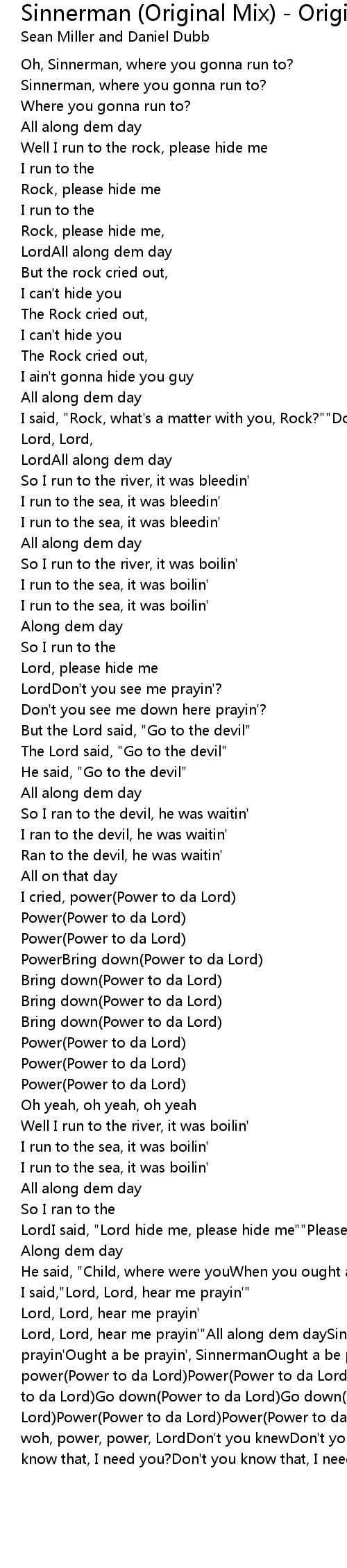Lord, Lord, hear me prayin'"All along dem daySinnerman you ought a be prayin'Ought a be prayin', SinnermanOught a be prayin'All on that dayI cried, power(Power to da Lord)Power(Power to da Lord)Power(Power to da Lord)Power(Power to da Lord)Go down(Power to da Lord)Go down(Power to da Lord)Go down(Power to da Lord)Power(Power to da Lord)Power(Power to da Lord)Power(Power to da Lord)Oh woh, power, power, LordDon't you knewDon't you know, I need you Lord?Don't you know that, I need you?Don't you know that, I need you?Power, power, power Lord |