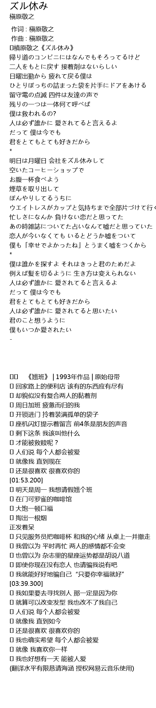 | [00:00.200] | ♪槙原敬之《ズル休み》 |