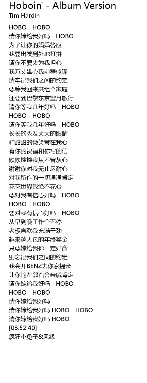 | [02:57.64] | 请你嫁给我好吗 HOBO HOBO |