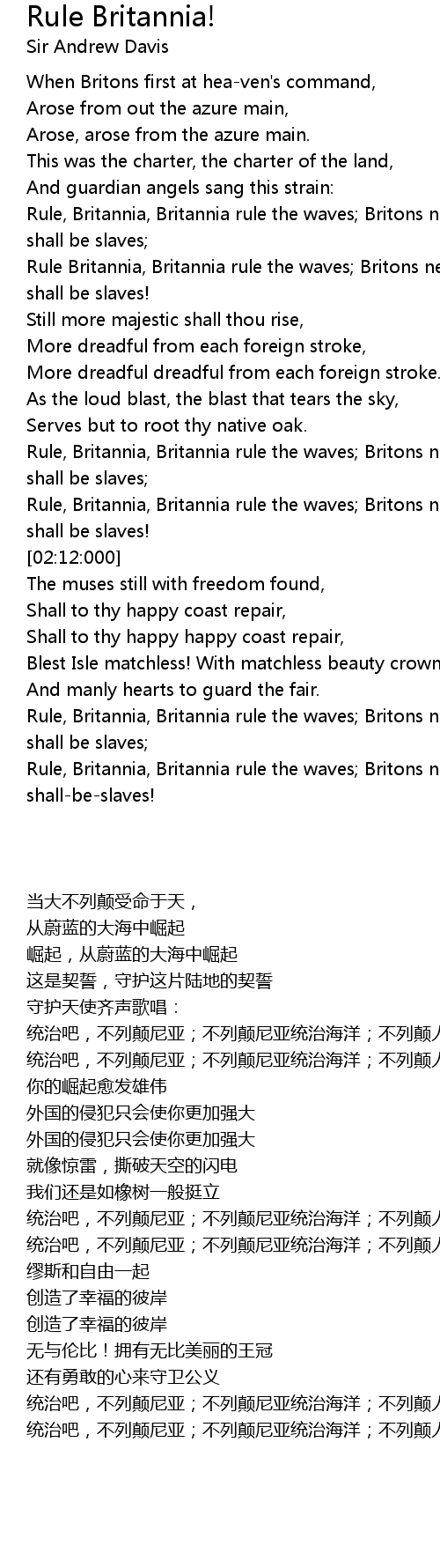Rule, Britannia, Britannia rule the waves; Britons never never never shall be slaves; |