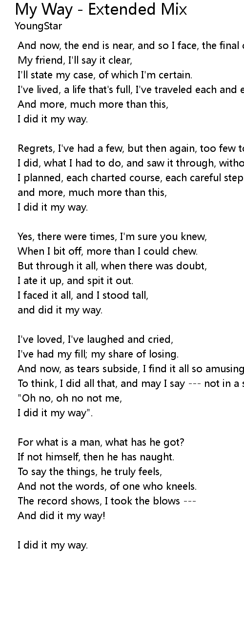 | I've lived, a life that's full, I've traveled each and every highway. | |