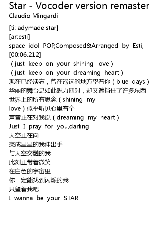 | [00:03.353] | space idol POP,Composed&Arranged by Esti, |