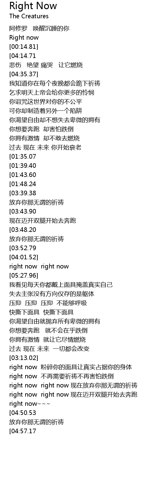 | [05:17.06][03:48.20][03:03.55][02:01.65] | right now right now 放弃你那无谓的祈祷 |