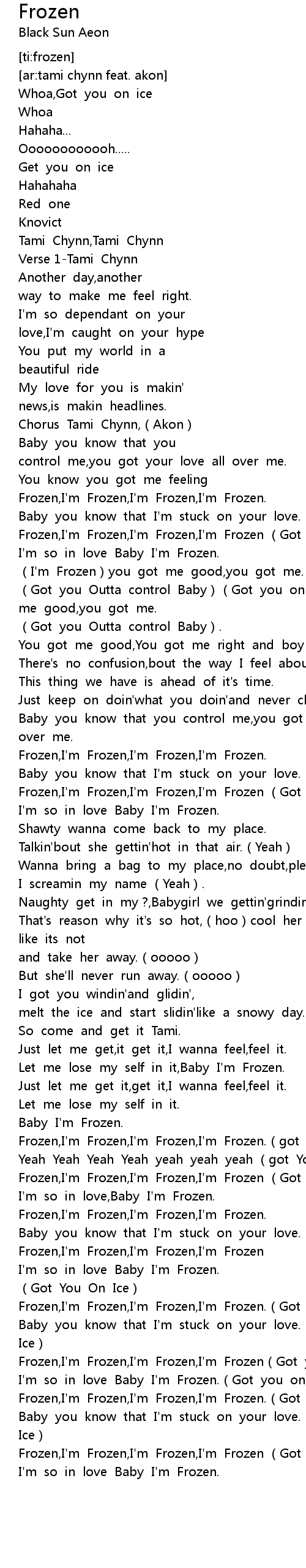 | [03:28.247] | Frozen, I' m Frozen, I' m Frozen, I' m Frozen Got you on Ice |