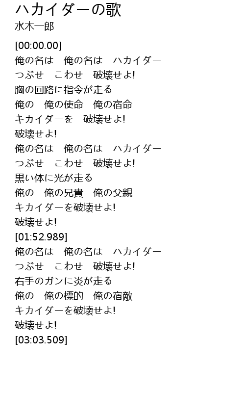 | [01:09.510] | 俺の名は 俺の名は ハカイダー |