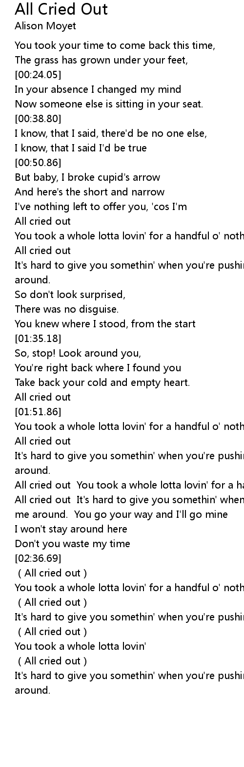 | [02:04.88] | All cried out You took a whole lotta lovin' for a handful o' nothin' All cried out It's hard to give you somethin' when you're pushin' an' a shovin' me around. You go your way and I'll go mine |