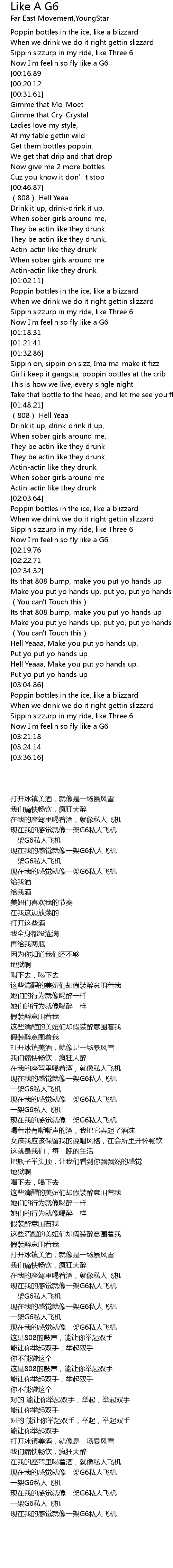 | [03:28.84][03:21.18] | Like a G6, Like a G6 |