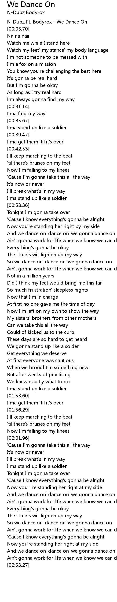 | [00:01.39] | NDubz Ft. Bodyrox We Dance On |