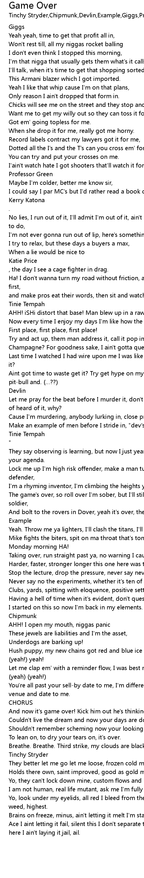 | The game' s over, so roll over I' m sober, but I' ll still kidnap a socalled soldier, | |