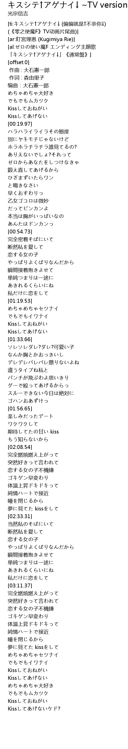 | [ti:キスシテ↑アゲナイ↓ (偏偏就是↑不亲你↓) (《零之使魔F》TV动画片尾曲)] | |