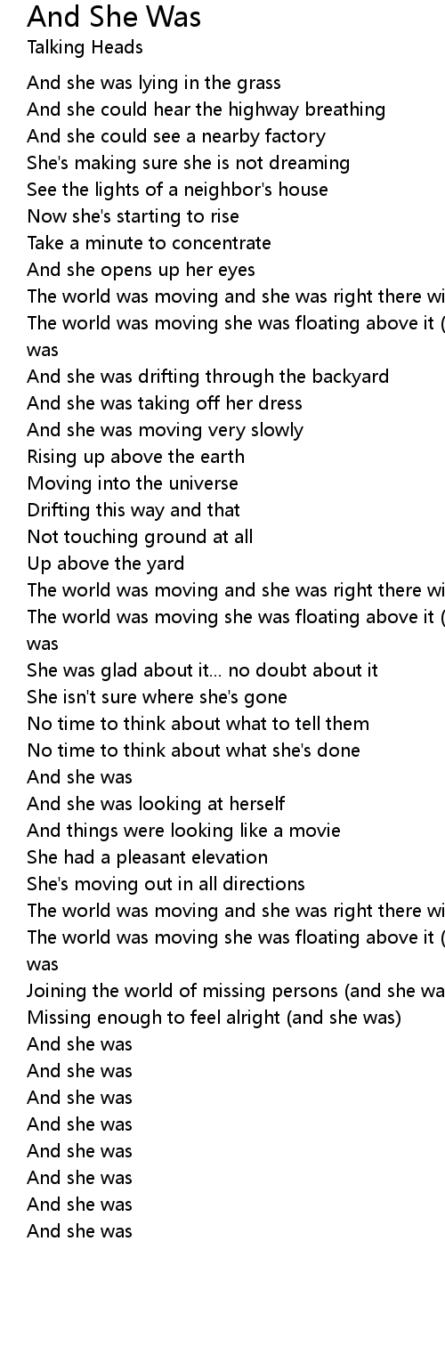The world was moving she was floating above it (and she was) and she was |