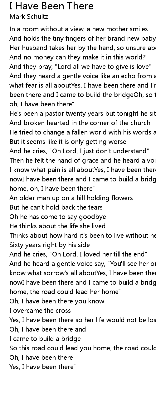 Then he felt the hand of grace and he heard a voice that said"I have been there I know what pain is all aboutYes, I have been there and I'm standing with you nowI have been there and I came to build a bridgeOh, so this road could lead you home, oh, I have been there" |