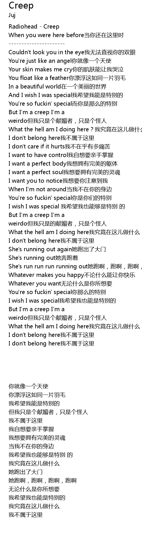| [01:00.16] | But I' m a creep I' m a weirdo dàn wǒ zhǐ shì gè xiàn mèi zhě, zhǐ shì gè guài rén |