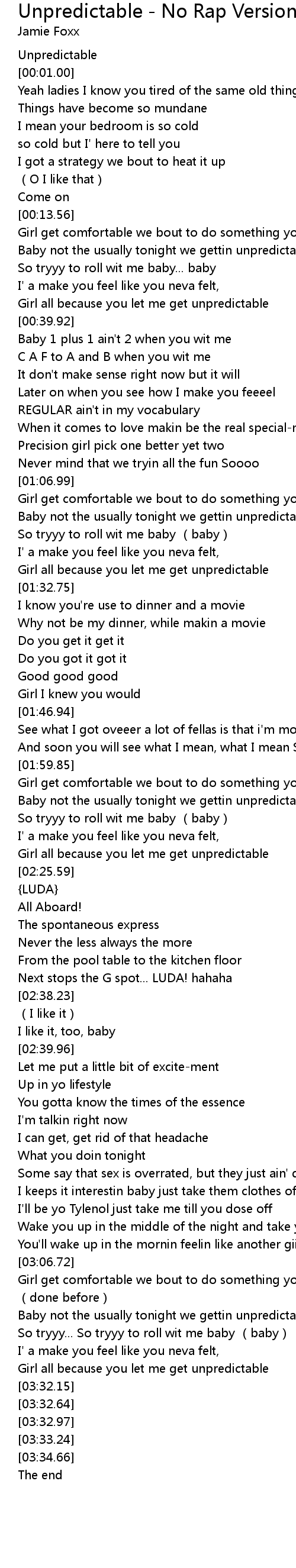| [03:13.30] | Baby not the usually tonight we gettin unpredictable |